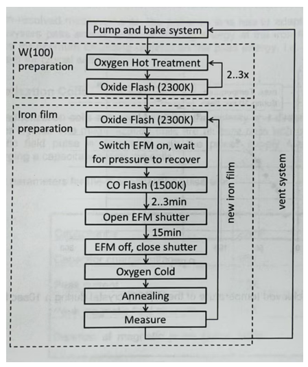 在烘烤Ferrum探测器和对Ebeam蒸发源灯丝除气后,在蒸铁前,接下来的步骤需要重复两到三次,一次制备下来需要2小时。