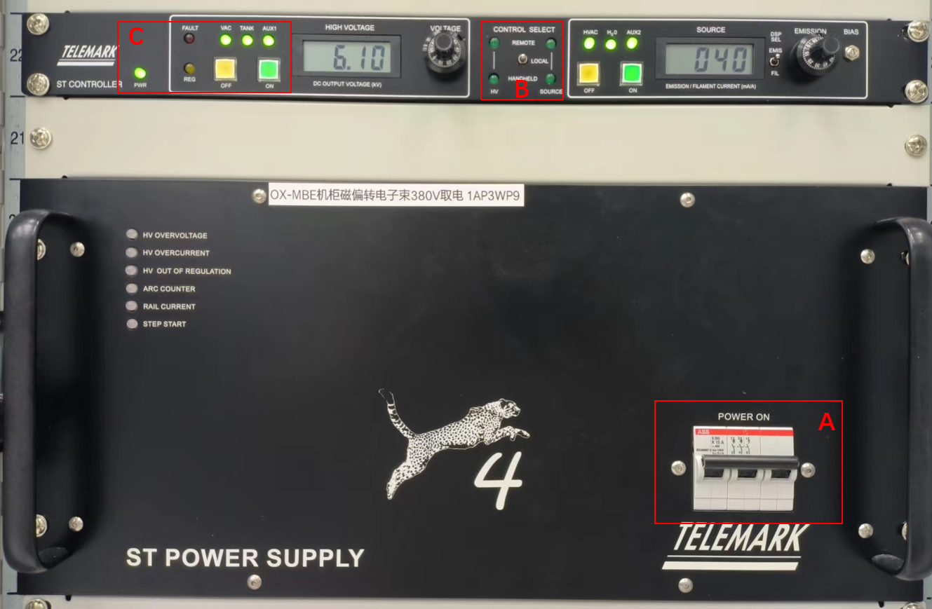 启动Ebeam的控制电源(图中A区域),此时机柜风扇开始运转,前面板对应控制器上的绿色 LED (PWR)亮起,黄色 REG LED (Regulation)亮起,绿色互锁 LED 亮起(图中C区域),等10min待系统稳定