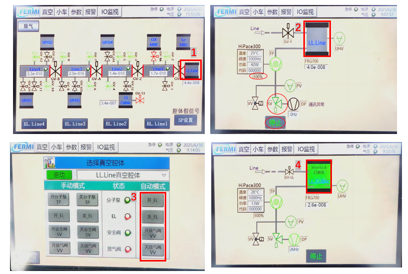 由此系统控制真空操作的腔体分别为 LL.Line、LL.Cubic、Se MBE。其中Se MBE为何睿华组腔体,非该组人员禁止操作。以LL.Line为例,取放样品操作步骤如下: