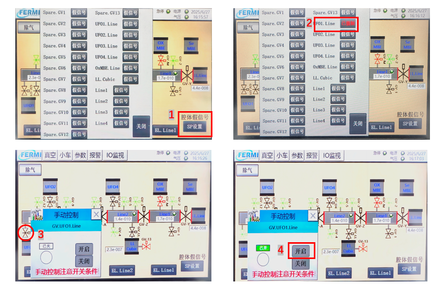点击UF01.Line假信号,告诉系统闸板阀两端真空满足开阀要求,假信号显示已强制,然后关闭此界面