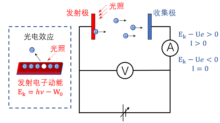 图 67 中左图是光电效应的示意图,当光照在样品上且光子能量超过材料的逸出功,吸收了光子的电子就会被激发到真空中。电子的动能Ek等于光子能量hv和逸出功W0的差值。图 67 中右图则是光电效应的实验示意图。需要注意的是,发射极和收集级是处于高真空环境的。