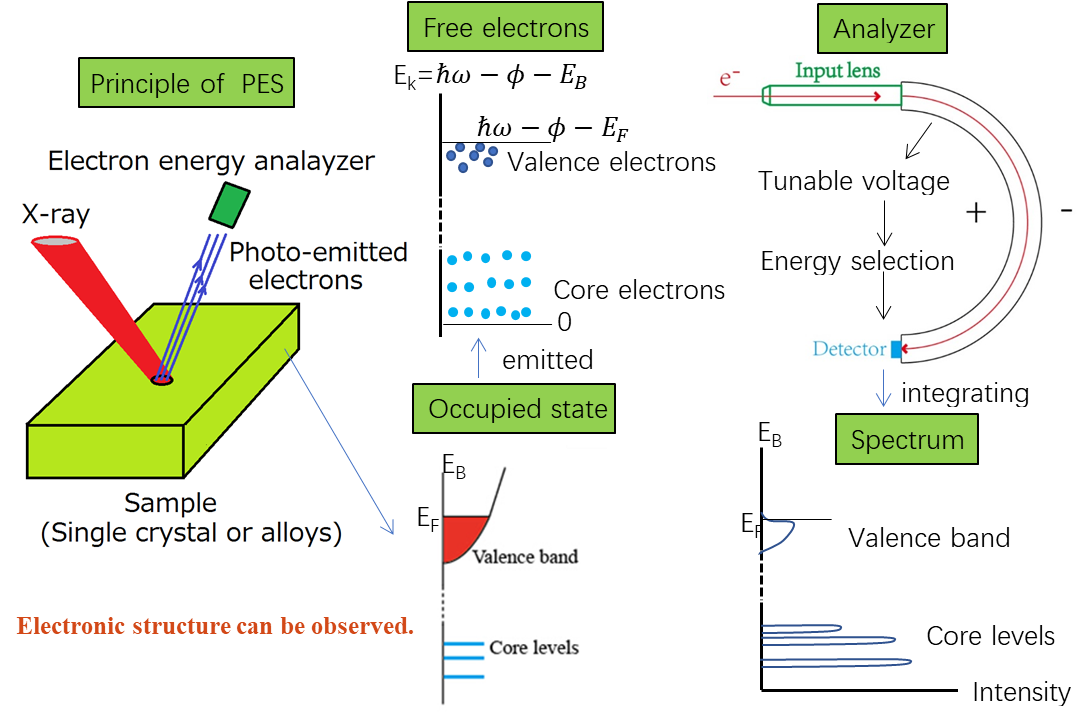 光电子能谱是利用光电效应对材料中电子的结合能进行测量的技术手段。使用X射线作为光源的称为XPS,使用紫外线作为光源的称为UPS。