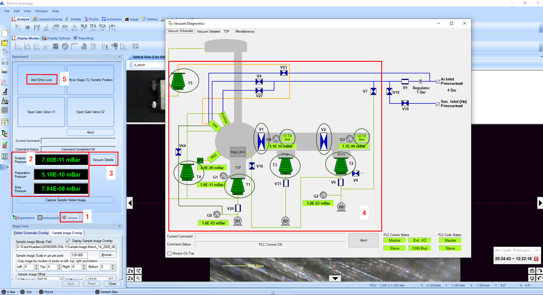 在软件控制界面,点击“Open Gate Valve V1”,打开闸板阀V1,移动传样杆2将样品插入分析腔内的样品台;