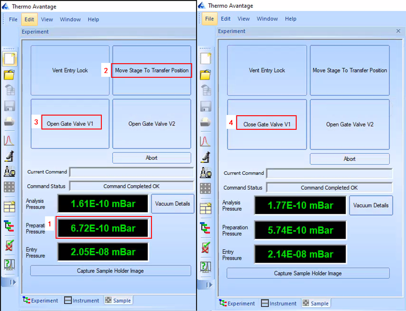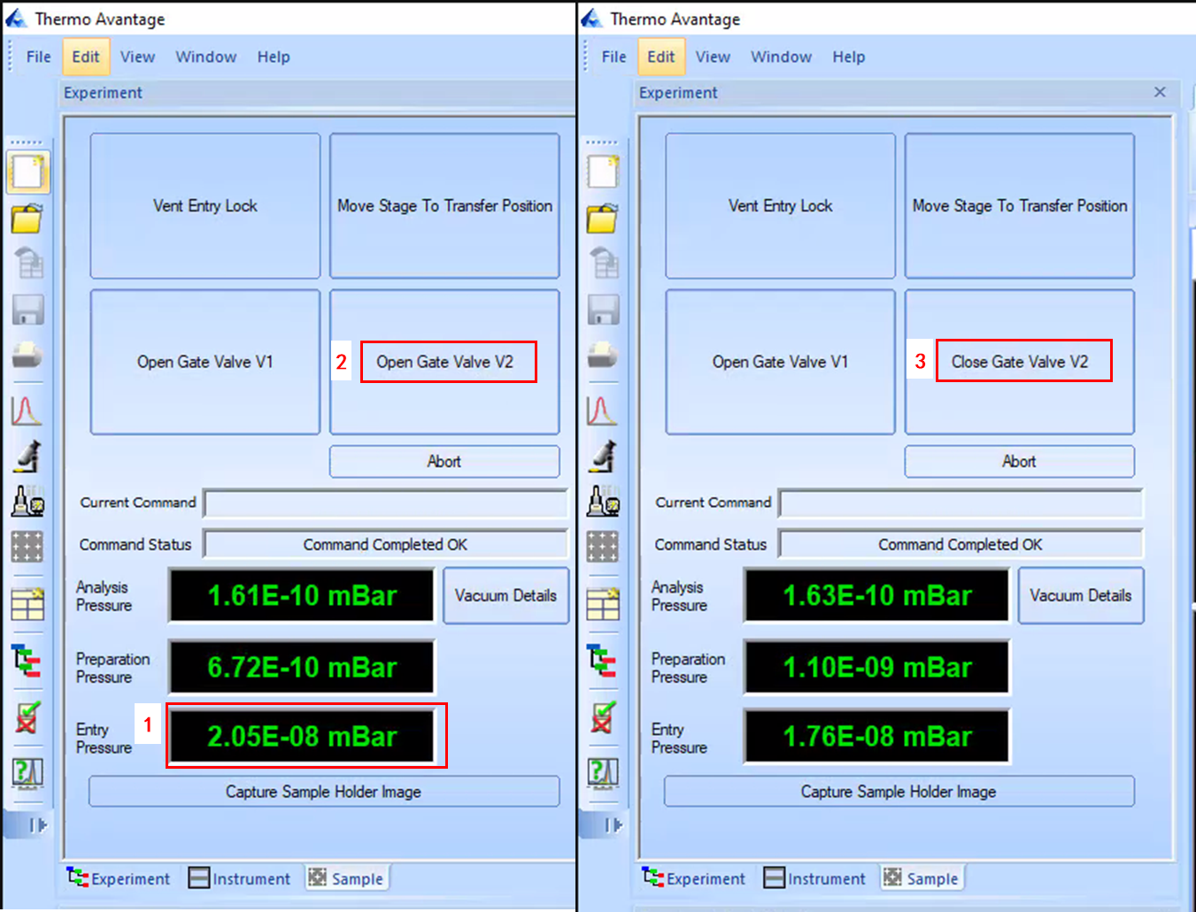 确认进样腔真空已达到1x10-10 mbar以下(约需1-2小时,视样品情况不同),记录当前真空度;